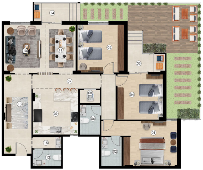 تشمل مساحات خضراء وحدائق، مع ممرات ومناطق للجلوس، لتوفير بيئة مريحة ومساحة للتنزه والاسترخاء داخل المشروع.